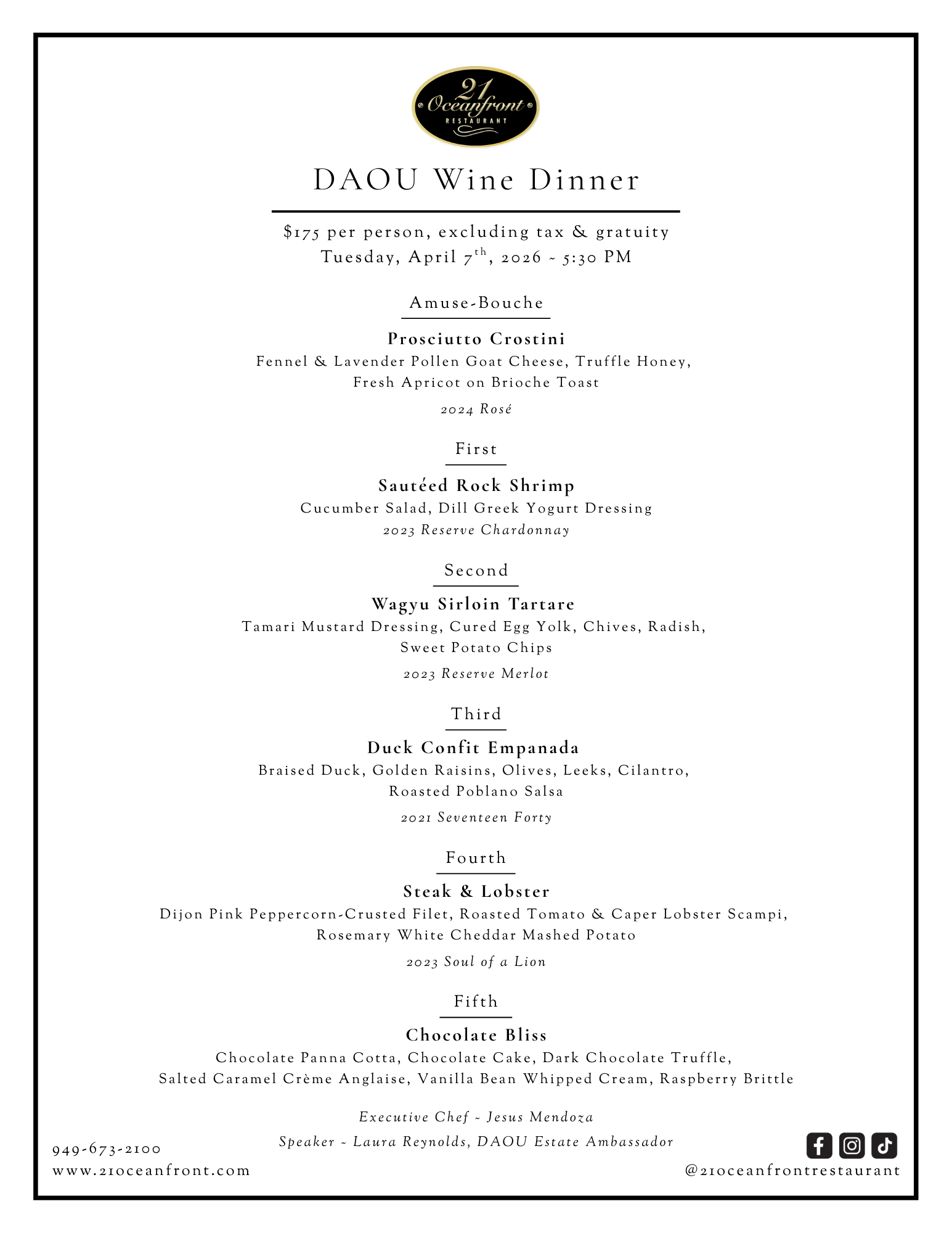 Join us for an unforgettable evening celebrating the artistry of DAOU Vineyards. Our culinary team will present a thoughtfully curated, multi-course tasting menu, with each course expertly paired with a distinctive DAOU wine to showcase the depth, elegance, and character of the portfolio.